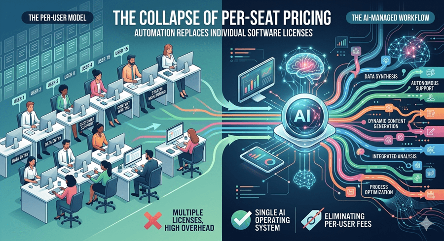 Instead of ten employees using ten software seats, one intelligent system can perform the same work automatically. That single system might generate reports, write code, manage workflows, and analyze data all at once.